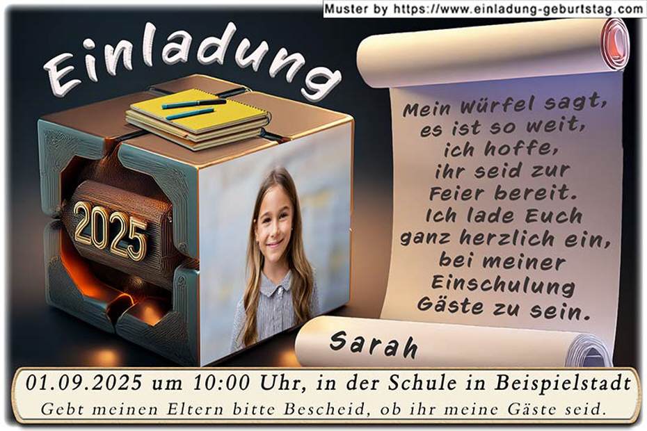 Beispiel: Mein Würfel sagt, es ist so weit, ich hoffe, ihr seid zur Feier bereit. Ich lade Euch ganz herzlich ein, bei meiner Einschulung Gäste zu sein.