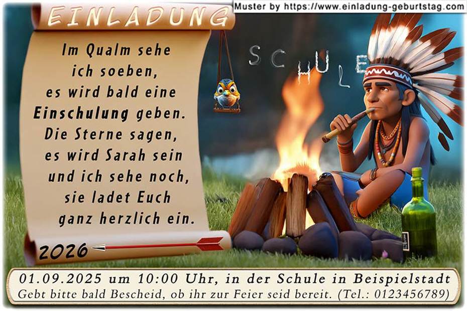 Beispiel: Im Qualm sehe ich soeben, es wird bald eine Einschulung geben. Die Sterne sagen, es wird Sarah sein und ich sehe noch, sie ladet Euch ganz herzlich ein. (oder nur das Wort Beispieltext und der Name des Kindes)