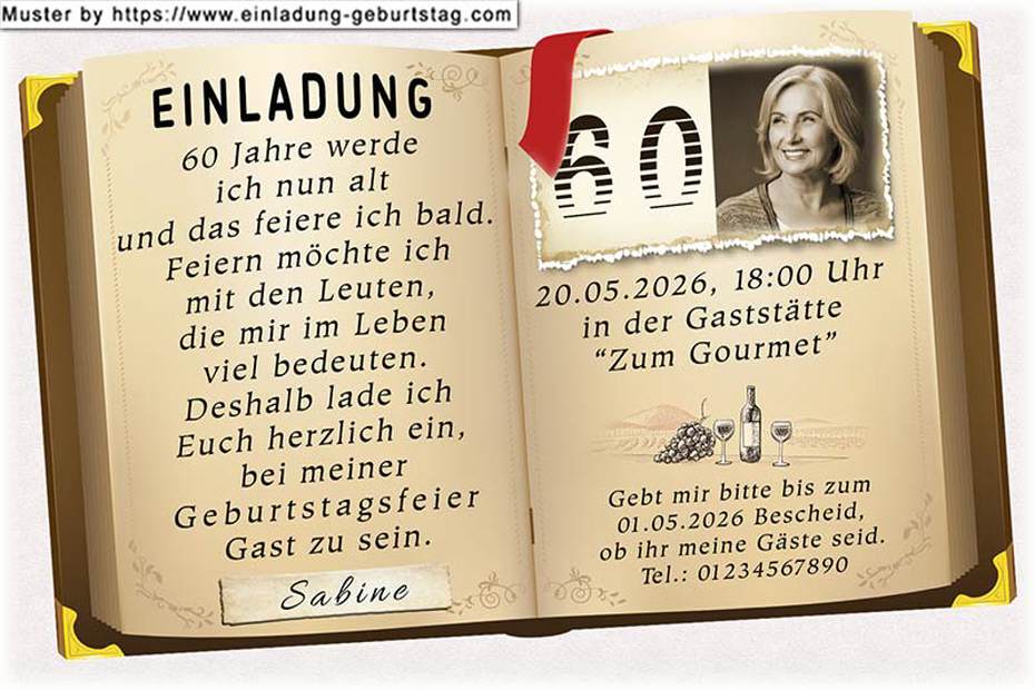 Die Einladungskarte im Stil eines aufgeschlagenen Buches. Ihr Foto wird mit einer Sepia Farbüberlagerung versehen und oben rechts eingesetzt. Daneben wird Ihr Alter gedruckt.