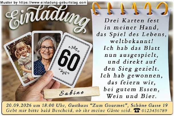 Beispiel: Drei Karten fest in meiner Hand, das Spiel des Lebens, weltbekannt! Ich hab das Blatt nun ausgespielt, und direkt auf den Sieg gezielt. Ich hab gewonnen, das feiern wir, bei gutem Essen, Wein und Bier.