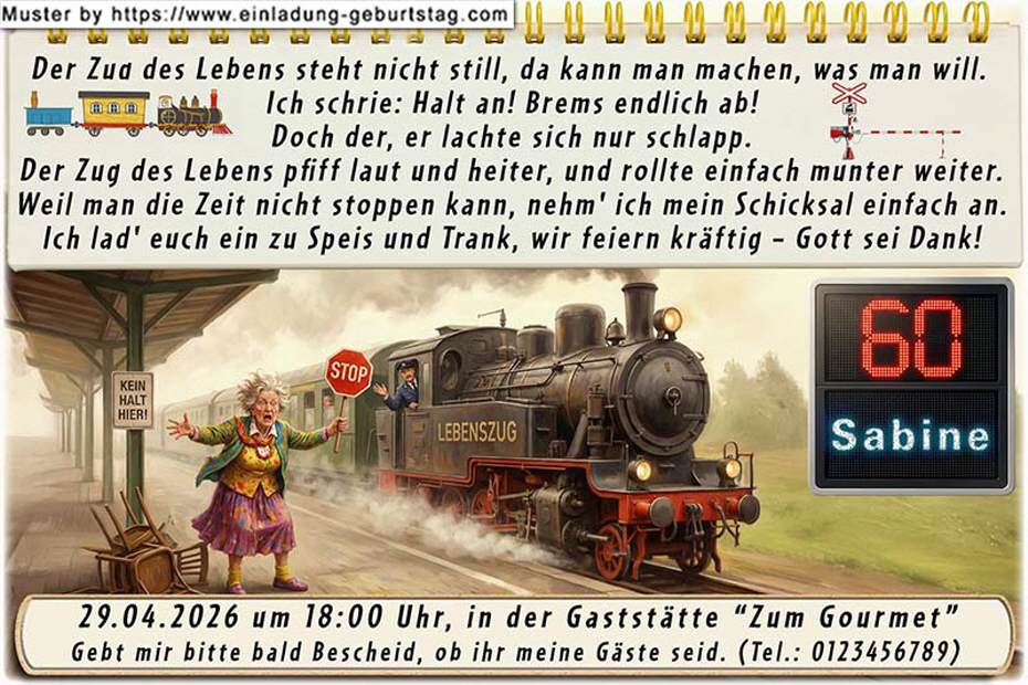 Ihr Alter und Ihr Name werden rechts in die Anzeigentafel eingesetzt. Der Zug des Lebens steht nicht still, da kann man machen, was man will. Ich schrie: Halt an! Brems endlich ab! Doch der, er lachte sich nur schlapp.