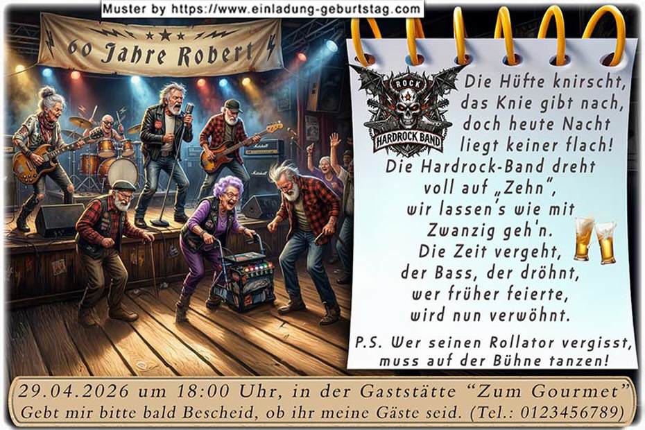 Beispiel: Die Hüfte knirscht, das Knie gibt nach, doch heute Nacht liegt keiner flach! Die Hardrock-Band dreht voll auf 'Zehn', wir lassen’s wie mit Zwanzig geh'n. Die Zeit vergeht, der Bass, der dröhnt, wer früher feierte, wird nun verwöhnt. P.S. Wer seinen Rollator vergisst, muss auf der Bühne tanzen!