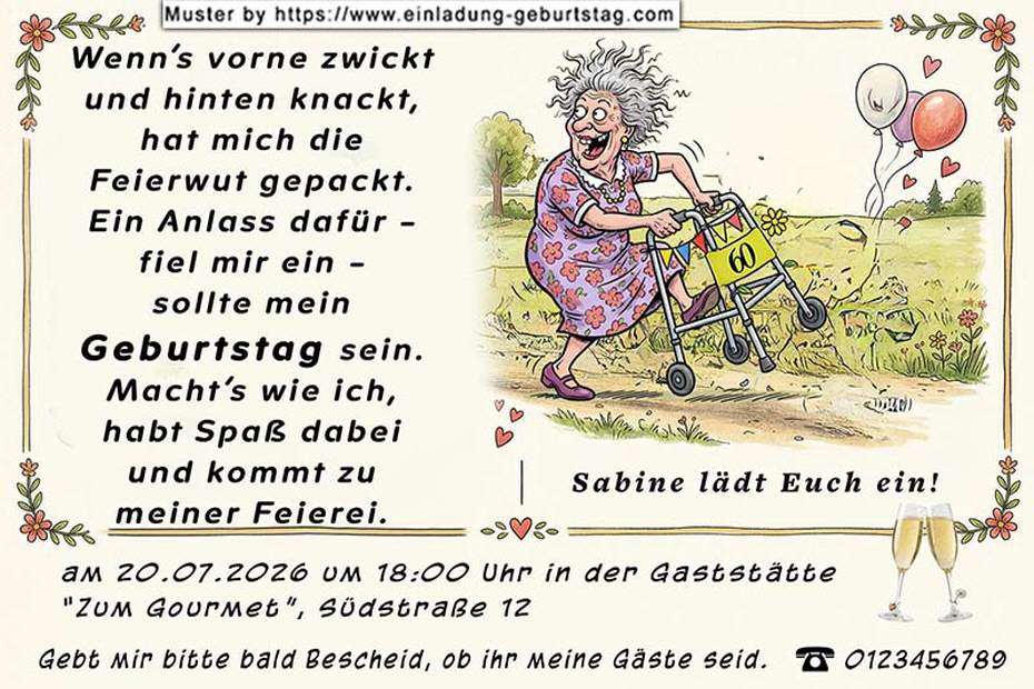 Beispiel: Wenn’s vorne zwickt und hinten knackt, hat mich die Feierwut gepackt. Ein Anlass dafür – fiel mir ein – sollte mein Geburtstag sein. Macht’s wie ich, habt Spaß dabei und kommt zu meiner Feierei.
