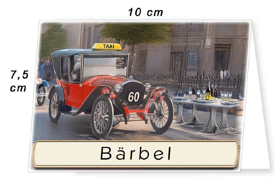 Vorn auf den Kühlergrill des originellen Taxis wird Ihr Alter gedruckt (im Beispiel 60). In das Textfeld unten wird der Name des Gastes eingetragen. Auf Wunsch kann das untere Textfeld zum selbst beschriften leer bleiben. Dies können Sie im Warenkorb wählen.