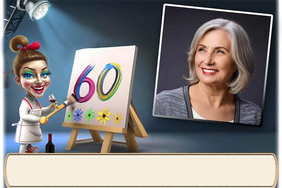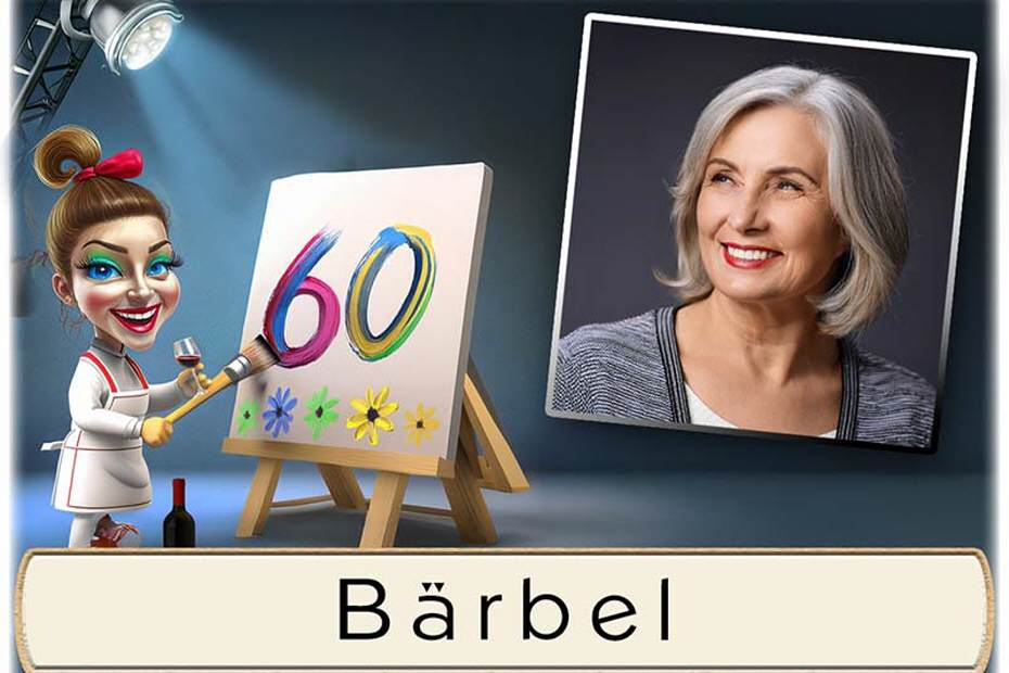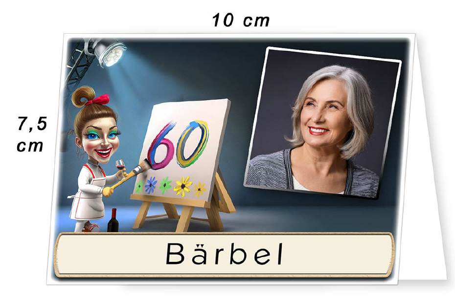 Ihr Foto wird mit einer Kontur versehen und leicht schräg gestellt rechts in die Karte eingesetzt. Auf der Leinwand befindet sich Ihr Alter. Unten auf die Karte wird der Name des Gastes gedruckt. Auf Wunsch kann das untere Textfeld zum selbst beschriften leer bleiben. Dies können Sie im Warenkorb wählen.