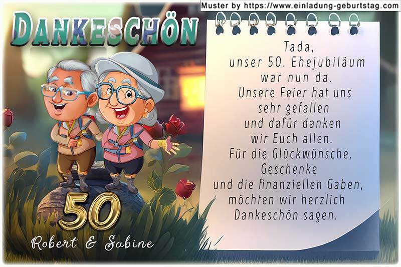 Ihre Jubiläumszahl befindet sich auf dem Stein, auf dem das Paar steht. Darunter werden Ihre Namen eingesetzt. Ihr Danksagungstext wird auf das Textfeld rechts gedruckt.