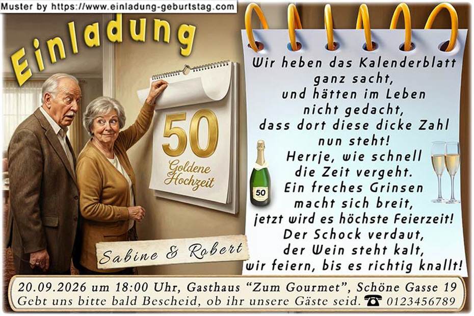 Beispiel: Wir heben das Kalenderblatt ganz sacht, und hätten im Leben nicht gedacht, dass dort diese dicke Zahl nun steht! Herrje, wie schnell die Zeit vergeht. Ein freches Grinsen macht sich breit, jetzt wird es höchste Feierzeit! Der Schock verdaut, der Wein steht kalt, wir feiern, bis es richtig knallt!
