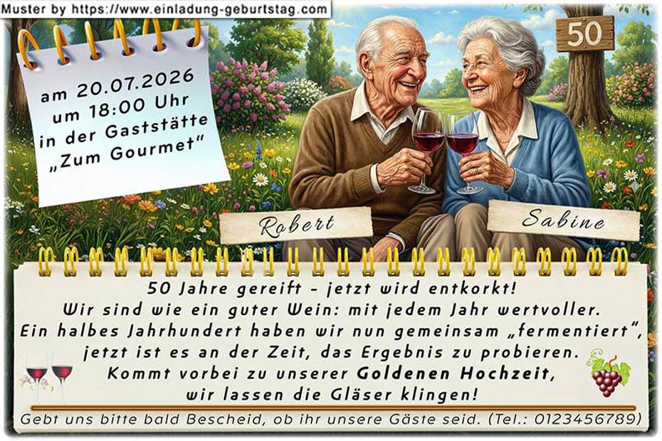 Beispiel: 50 Jahre gereift – jetzt wird entkorkt! Wir sind wie ein guter Wein: mit jedem Jahr wertvoller. Ein halbes Jahrhundert haben wir nun gemeinsam 'fermentiert', jetzt ist es an der Zeit, das Ergebnis zu probieren. Kommt vorbei zu unserer Goldenen Hochzeit, wir lassen die Gläser klingen!