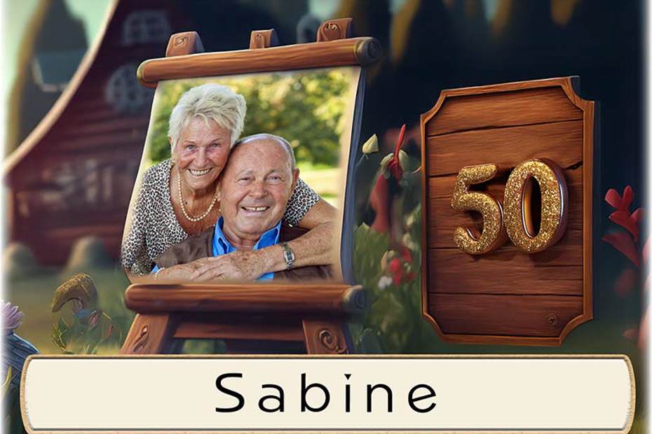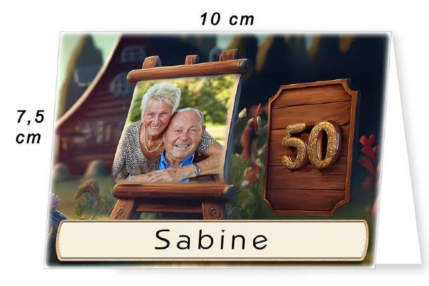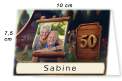 Ihr Foto wird in eine Staffelei eingesetzt. Ihre Jubiläumszahl befindet sich rechts daneben. Der Name des Gastes wird in das Textfeld unten gedruckt. Auf Wunsch kann das untere Textfeld zum selbst beschriften leer bleiben. Dies können Sie im Warenkorb wählen.