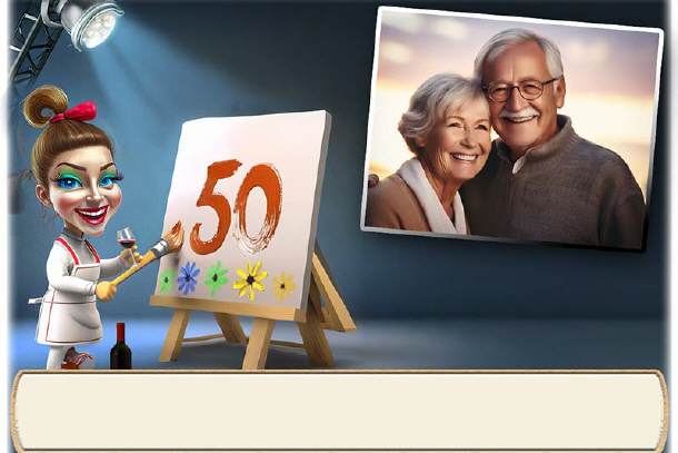 Ihr Foto wird mit einer Kontur versehen und leicht schräg gestellt rechts in die Karte eingesetzt. Auf der Leinwand befindet sich Ihre Jubiläumszahl. Unten auf die Karte wird der Name des Gastes gedruckt. Auf Wunsch kann das untere Textfeld zum selbst beschriften leer bleiben. Dies können Sie im Warenkorb wählen.