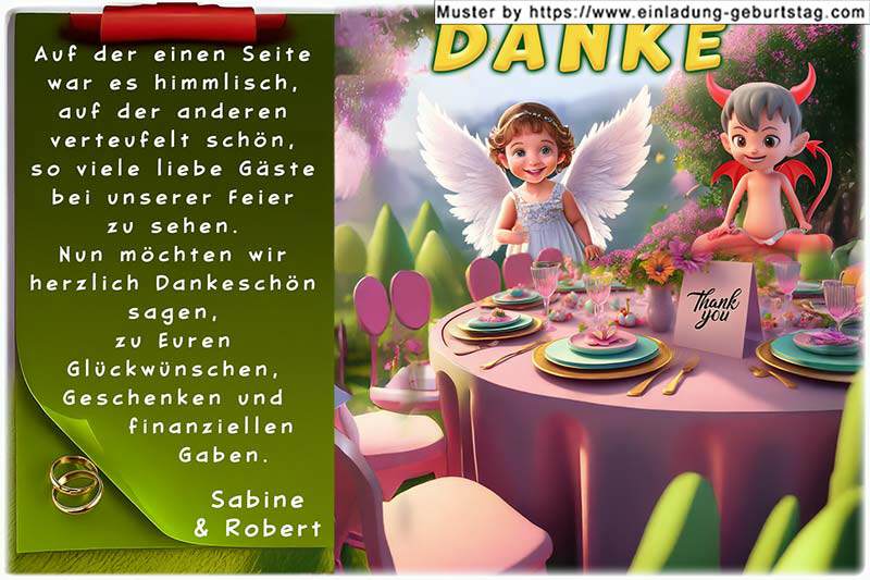Ihr Danksagungstext und Ihre Namen befinden sich auf der grünen Textfläche an der Seite. Hinter die aufgeklappte Ecke werden Eheringe eingesetzt.