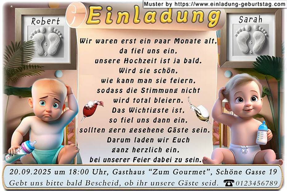 Sie wünschen ein Vorschaubild dieser Einladungskarte mit Ihren Angaben ohne gleich eine Bestellung aufzugeben - hier können Sie es unverbindlich anfordern und nach dem Erhalt selbst entscheiden, ob Sie diese Karten bestellen möchten.