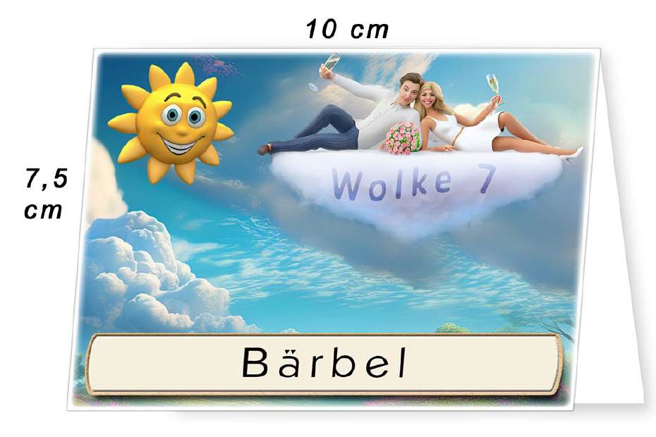 Das Hochzeitspaar schwebt auf Wolke 7, mit Sektgläsern in der Hand. Der Name des Gastes wird in das Textfeld unten gedruckt. Auf Wunsch kann das untere Textfeld zum selbst beschriften leer bleiben. Dies können Sie im Warenkorb wählen.