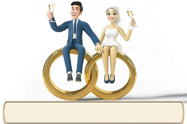 Das Hochzeitspaar mit 2 Sektgläsern in der Hand sitzt auf 2 Eheringen. Unten auf die Karte wird der Name des Gastes gedruckt. Auf Wunsch kann das untere Textfeld zum selbst beschriften leer bleiben. Dies können Sie im Warenkorb wählen.