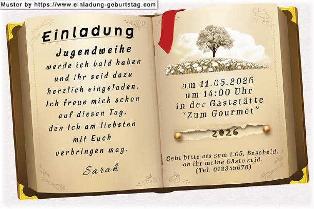 Auf der linken Buchseite befindet sich dein Einladungstext. In die rechte Buchseite werden Datum, Uhrzeit und Ort und die Bitte um eine Rückmeldung eingesetzt.