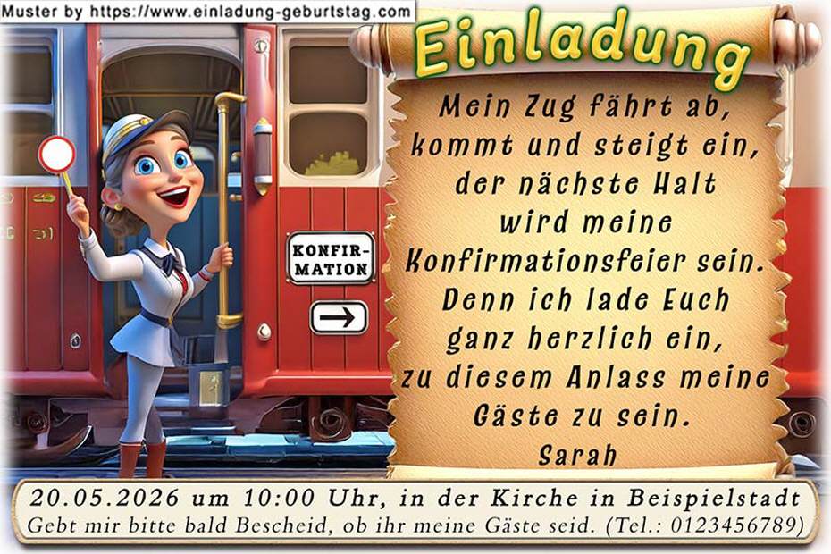 Dein Zug zur Konfirmationsfeier fährt ab und du lädst deine Gäste zum Einsteigen ein. Über den Pfeil an der Zugwand wird das Wort Konfirmation eingesetzt.