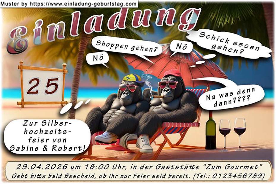 Beispiel: Shoppen gehen? Nö Schick essen gehen? Nö Na was denn dann???? Zur Silberhochzeitsfeier von Sabine und Robert! (oder nur das Wort Beispieltext und Ihre Namen)