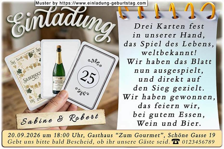 Beispiel: Drei Karten fest in unserer Hand, das Spiel des Lebens, weltbekannt! Wir haben das Blatt nun ausgespielt und direkt auf den Sieg gezielt. Wir haben gewonnen, das feiern wir, bei gutem Essen, Wein und Bier.