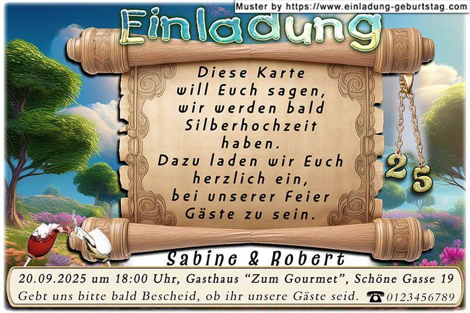 Beispiel: Diese Karte will Euch sagen, wir werden bald Silberhochzeit haben. Dazu laden wir Euch herzlich ein, bei unserer Feier Gäste zu sein.
