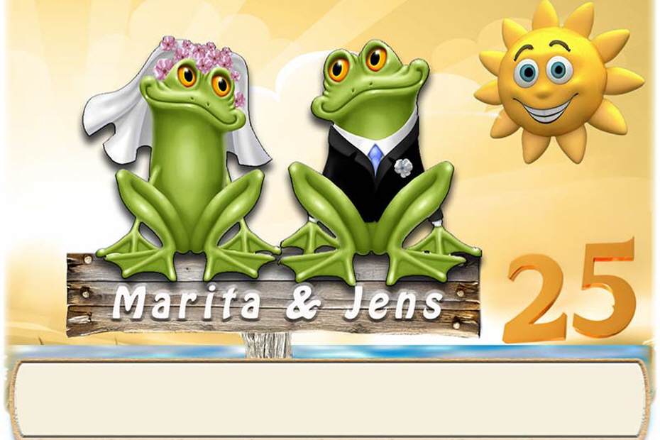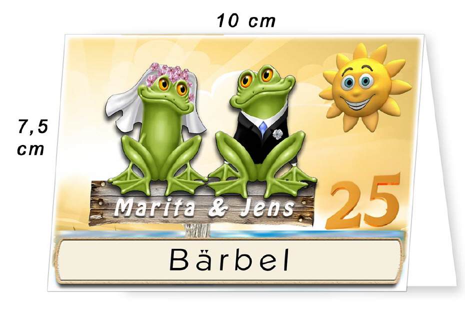 Auf das Brett, auf dem die beiden Frösche sitzen, werden Ihre Namen gedruckt. Der Name des Gastes wird in das Textfeld unten gedruckt. Auf Wunsch kann das untere Textfeld zum selbst beschriften leer bleiben. Dies können Sie im Warenkorb wählen.