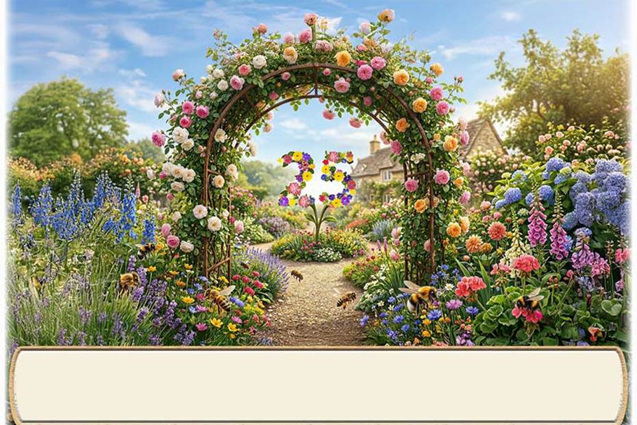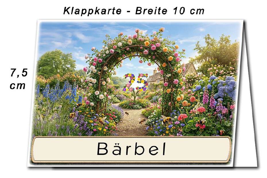 Ihre Jubiläumszahl als Blume innerhalb eines Rosenbogens. Unten auf die Karte wird der Name des Gastes gedruckt. Auf Wunsch kann das untere Textfeld zum selbst beschriften leer bleiben. Dies können Sie im Warenkorb wählen.