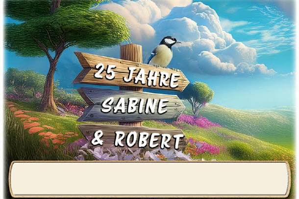 Auf dem Wegweiser befinden sich Ihre Jubiläumszahl und Ihre Namen. Der Name des Gastes wird in das Textfeld unten gedruckt. Auf Wunsch kann das untere Textfeld zum selbst beschriften leer bleiben. Dies können Sie im Warenkorb wählen.