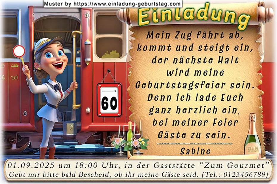 Ihr Zug zur Geburtstagsfeier fährt ab und Sie laden Ihre Gäste zum Einsteigen ein. Unter den Pfeil an der Zugwand wird Ihr Alter eingesetzt.