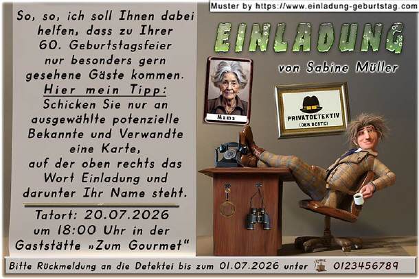 Ein Privatdetektiv hilft Ihnen dabei, dass zu Ihrer Geburtstagsfeier nur besonders gern gesehene Gäste kommen, Ihr Alter wird in den Text integriert. Ihr Name wird unter die Überschrift eingesetzt.