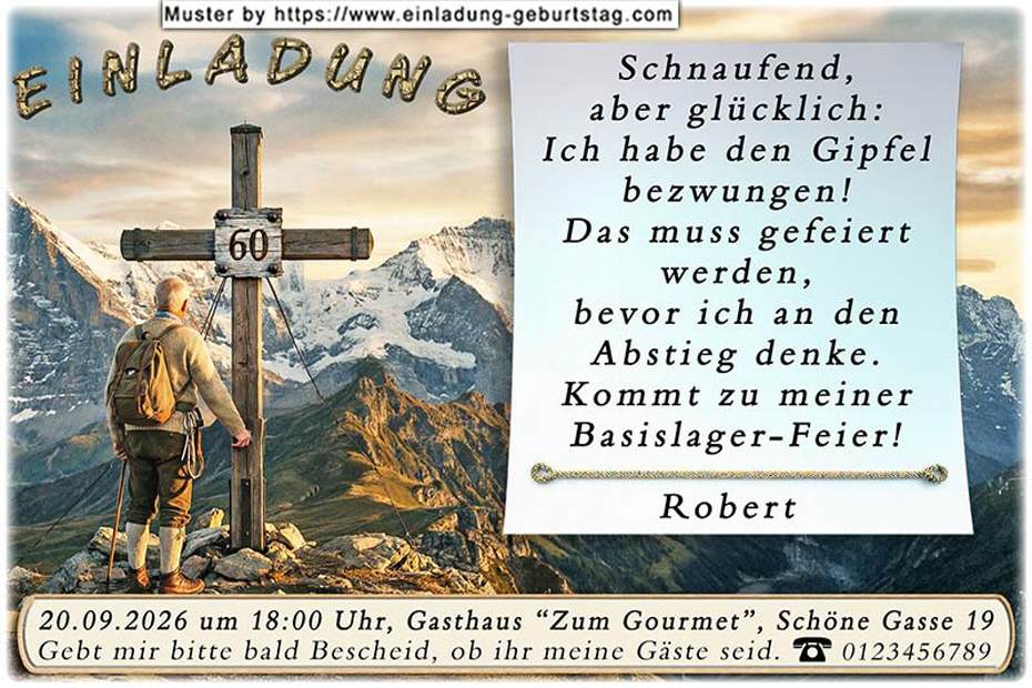 Beispiel: Schnaufend, aber glücklich: Ich habe den Gipfel bezwungen! Das muss gefeiert werden, bevor ich an den Abstieg denke. Kommt zu meiner Basislager-Feier!