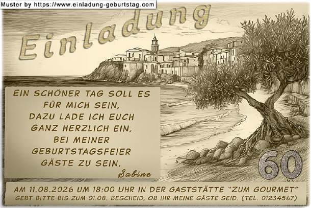 Ein schönes Bild im Sepia Farbstil dient dieser Einladungskarte als Hintergrund. Sämtliche Textbestandteile können Sie frei anpassen. Ihr Alter wird unten rechts eingesetzt.