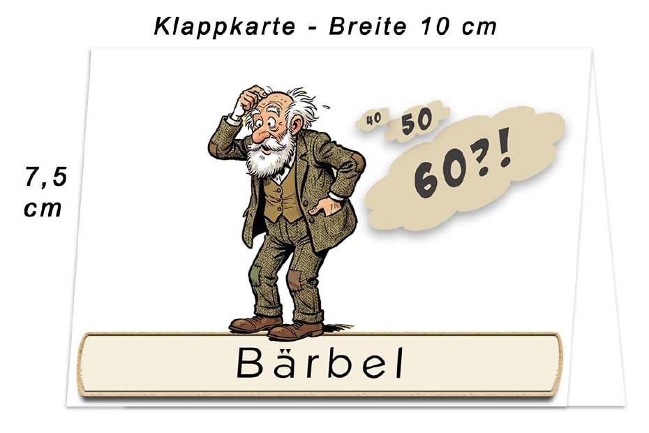 Die lustige Tischkarte mit dem grübelnden Mann. In die Gedankenblase wird Ihr Alter eingesetzt. Unten auf die Karte wird der Name des Gastes gedruckt. Auf Wunsch kann das untere Textfeld zum selbst beschriften leer bleiben. Dies können Sie im Warenkorb wählen.
