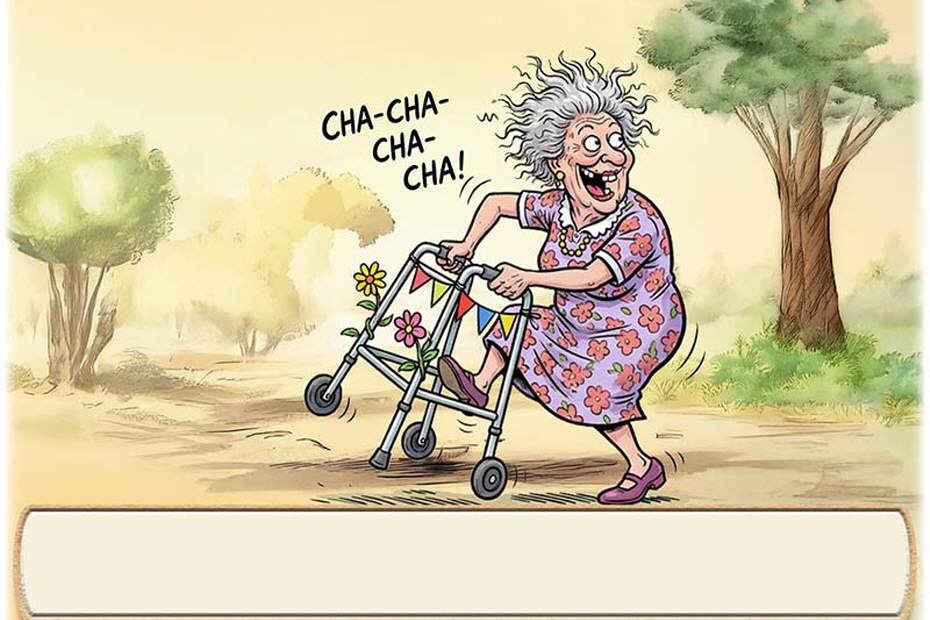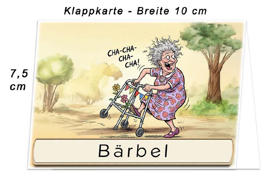 Die lustige Tischkarte mit der Frau am Rollator. Unten auf die Karte wird der Name des Gastes gedruckt. Auf Wunsch kann das untere Textfeld zum selbst beschriften leer bleiben. Dies können Sie im Warenkorb wählen.
