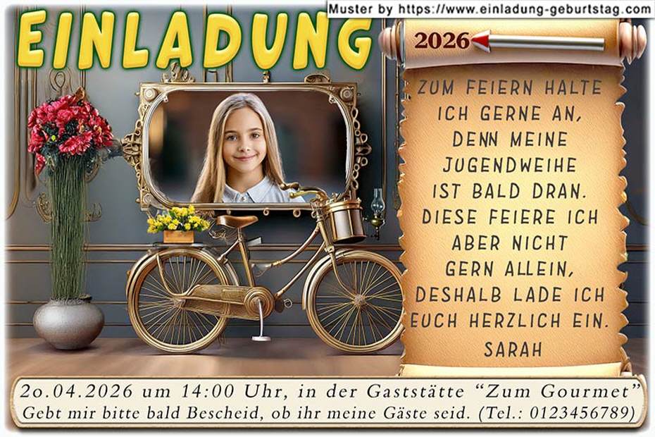Du wünschst ein Vorschaubild dieser Einladungskarte mit deinen Angaben ohne gleich eine Bestellung aufzugeben - hier kannst du es unverbindlich anfordern und nach dem Erhalt selbst entscheiden, ob du diese Karten bestellen möchtest.