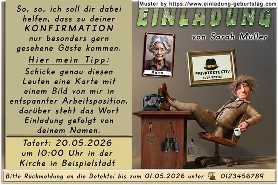 Ein Privatdetektiv hilft dir dabei, dass zu deiner Konfirmation nur besonders gern gesehene Gäste kommen. Dein Name wird unter die Überschrift eingesetzt.