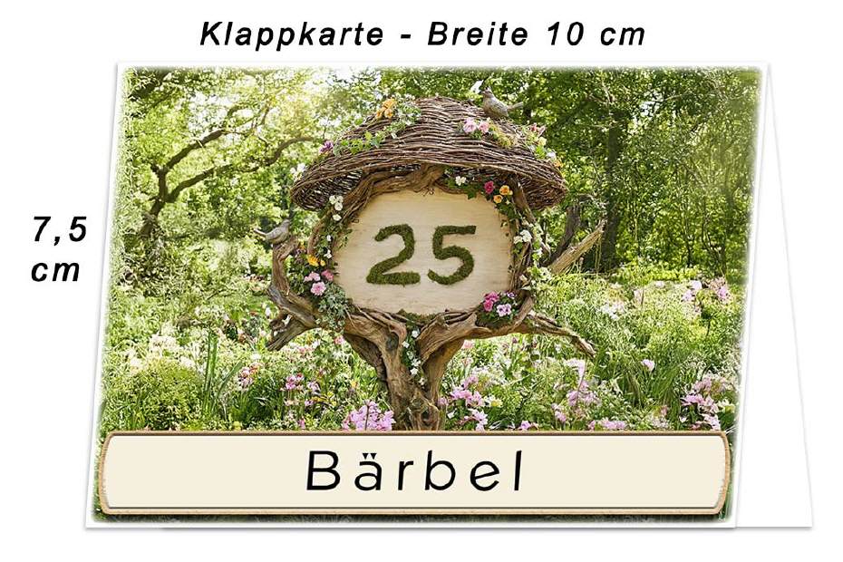 Ihre Jubiläumszahl in der Natur. Unten auf die Karte wird der Name des Gastes gedruckt. Auf Wunsch kann das untere Textfeld zum selbst beschriften leer bleiben. Dies können Sie im Warenkorb wählen.